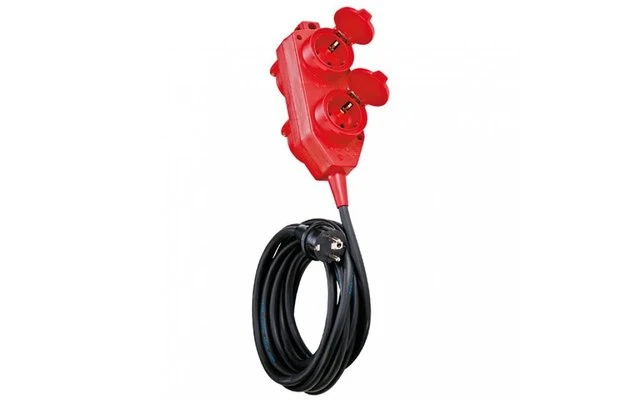 4-fach Steckdosenblock Für die Verwendung im Freien. Spritzwassergeschützt. Mit Schutzkontakt-Stecker und 4-fach Steckdosenblock mit Klappdeckel und 5m Polychlorid-Anschlusskabel H07RN-F 3G 1,5mm².