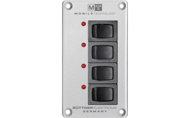 12V Schalterpanel mit 4 Kippschalter für 4 getrennte Stromkreise. Jeder Schalter (Stromkreis) besitzt eine eigene Status-LED, welche bei aktivierter Schaltung leuchtet.