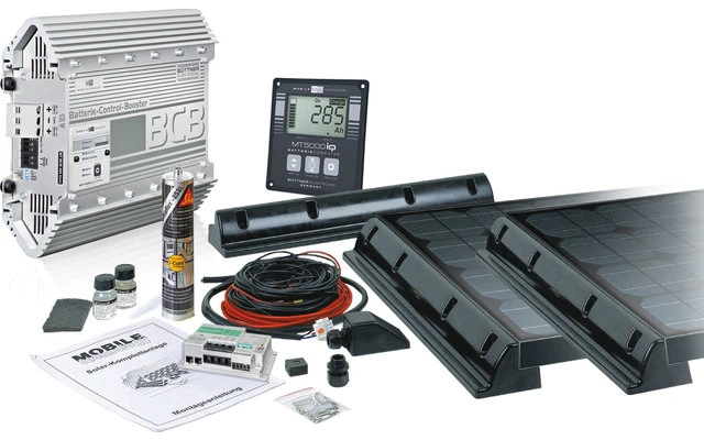 Die optimale Ergänzung für jedes Reisemobil Können einfach parallel zu einer bestehenden Basiselektronik in jedem Reisefahrzeug installiert werden. Das Kombigerät BCB 20/20 sorgt dafür, dass bei Netzanschluss (230V) ein zusätzlicher Ladestrom von 20 A zur Verfügung steht. Während der Fahrt arbeitet der BCB im Boosterbetrieb. Er schaltet sich bei Bedarf zu, fordert 20 A Ladestrom an, reguliert auf die geforderte Ladespannung (Batterietyp einstellbar) und lädt mit optimaler Kennlinie die Bordbatterie/n voll. Er garantiert auch konstanten Ladestrom bei „Euro 5“ und „Euro 6“ Fahrzeugen die mit einer Abregelung der Lichtmaschine ausgestattet sind. Der BCB25/20 verfügt über die modernsten Kennlinien (IUoU) um Nass-, Gel-, LiFePO4- und AGM-Batterien entsprechend der Batterietemperatur (Fühler im Lieferumfang) optimal zu laden.Der Batterie Computer MT 5000iQ steuert und überwacht das System. Auf Knopfdruck wird z.B. die noch vorhandene Kapazität oder die Restlaufzeit angezeigt. Auch die Solaranlage integriert sich perfekt ins System. Die PowerPacks sind mit 110Wp-72zelligen MT-Black-Line Modulen ausgestattet. Speziell für Reisefahrzeuge entwickelt und optimal auf das Komplettset abgestimmt garantieren sie optimale Ladeleistung auch bei ungünstigen Wetterbedingungen.