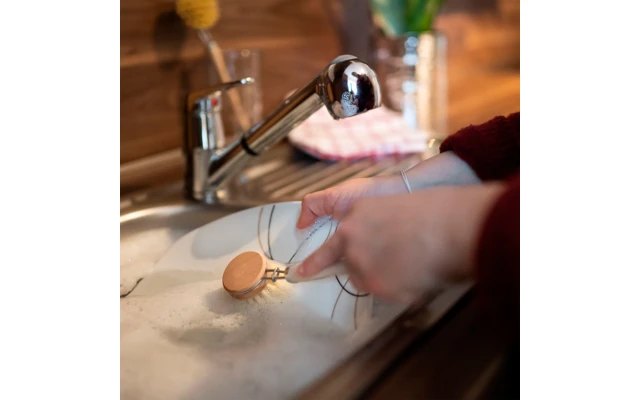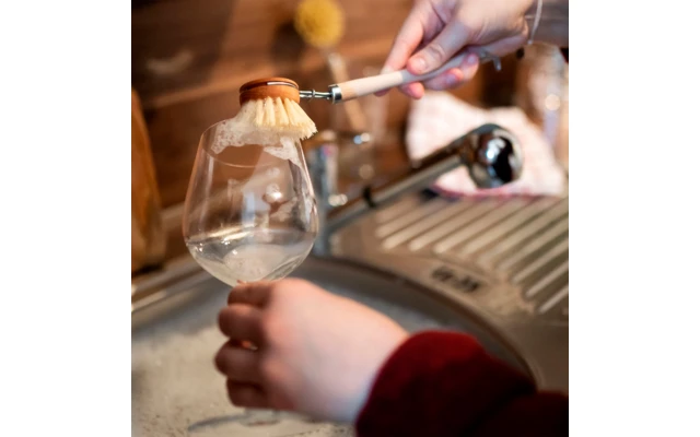 Die Holzbürste reinigt zuverlässig, gründlich und ist perfekt zum Abspülen von Geschirr, Töpfen, Pfannen & Co. geeignet. Ein Tropfen Spülmittel reicht aus, um genug Schaum zu erhalten. Die natürlichen Borsten bleiben im Gegensatz zu Kunststoff auch bei hohen Temperaturen stabil. Du kannst die Bürste auch universell für die Reinigung von anderen Haushaltsgegenständen oder im Garten verwenden.
