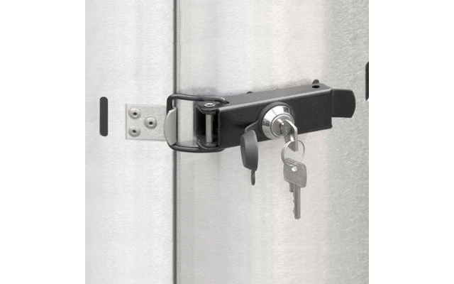 Standrohr, Gehäuse mit Scharniertür, Ablagetisch im Aluminiumdekor und Standfuß aus gebürstetem Edelstahl. Abschließbarer Türverschluß. Herausziehbarer Gasflaschentisch für einfaches installieren und entnehmen der Gasflasche. Eingriff ummantelt. Fahrbar (inklusive Rollenset). Standrohr kann einfach für Transport und Aufbewahrung auf ca. 1,55 m abgesenkt werden.