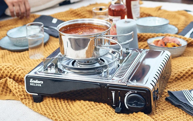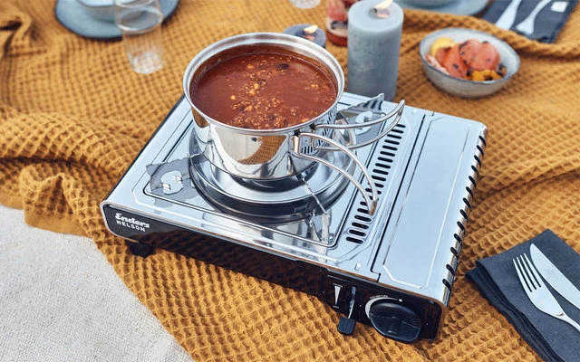 Leistungsstarker Kartuschen Gaskocher mit stufenlos regulierbarem Brenner im hochwertigem Edelstahl-Design.
