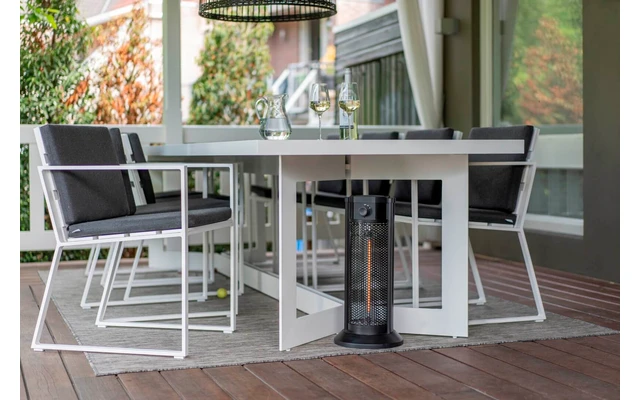 Mit der Eurom Under Tischheizung können Sie genießen, wenn es draußen kühler wird. Die Tischheizung ist für den Einsatz im Garten oder auf Ihrem Balkon geeignet. Die Carbonlampe kann auf 450 und 900 Watt eingestellt werden und bietet angenehme Wärme. Diese kompakte Terrassenheizung passt unter jeden Tisch und strahlt 360 Grad Wärme aus. Die Unter-Tischheizung ist auch spritzwassergeschützt (IP24).