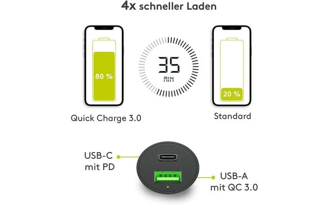 Dual-USB Auto Schnellladegerät USB-C Power Delivery Das Ladgerät im Mini-Format lädt zwei Geräte gleichzeitig am Zigarettenanzünder über USB-A oder USB-C. Lädt bis zu 4x schneller als Standardladegeräte (in 30min. von 0% auf 50%). Schnellladegerät speziell für Apple iPhone und iPad.