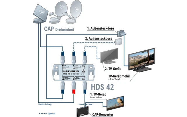 Master/Slave Umschalter – Einfacher Anschluss einer CAP-Dreheinheit und des Antennen-Sets HDS 166 – Schaltet automatisch das empfangene Sat-Signal an den TV weiter.