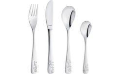 Kinderbesteckset 4-teilig bestehend aus 1 Kindermesser, 1 Kindergabel, 1 Kinderlöffel, 1 Kinderteelöffel, für den kleinen Esser, Material: Klingenstahl 13/0, Edelstahl 18/10, Ausführung: hochglanzpoliert, spülmaschinengeeignet.