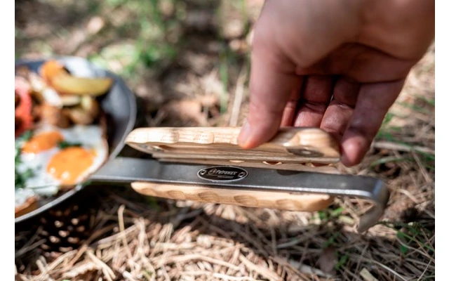 Der Holzgriff lässt sich einhändig über den Magnetverschluss am Pfannenstiel befestigen. So hast du immer eine Hand frei und kannst dich ganz deinem Braterlebnis widmen. Die Griffschalen aus geöltem Holz umschließen den Pfannenstiel und stoppen die Wärmeleitung. Fleisch, Fisch und Gemüse wird richtig eingeheizt, während du uneingeschränkten und sicheren Zugriff darauf hast. Egal welche deiner Petromax Schmiedepfannen du schwingst, der Holzgriff ist für jede Größe ausgelegt und eine natürliche Erleichterung für deine Draußen-Küche.