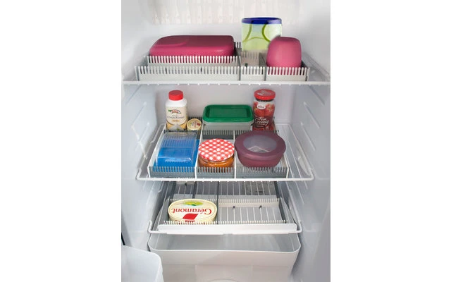 Das Stecksystem besteht aus 8 Stauleisten, die einen variablen Facheinsatz ergeben. Die Längs- und Breitstege aus flexiblem Kunststoff bieten optimalen Trennschutz für verschiedene Artikel und stabilisieren dadurch ihre Gegenstände bruchsicher und rutschfest. An der oberen Längsseite einer Stauleiste befinden sich viele Zinken, die durch einfaches Zusammenstecken eine stabile und feste Verbindung ergeben. Die enge Rasterung der Zinken ermöglicht eine flexible Verstellbarkeit auf fast jeden Abstand. Geeignet für Lebensmittel aller Art, Aufbewahrungsbehältnisse, Einmachgläser,