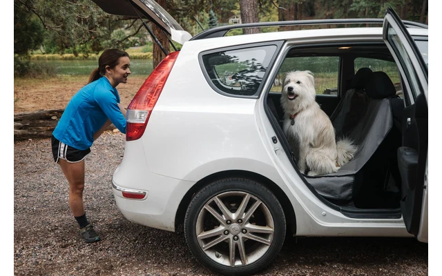 Strapazierfähiger, wasserfester, maschinenwaschbarer Autositzbezug, der sich auf der Rückbank oder als Hängematte anbringen lässt. Die sichere Befestigung hält den Bezug an Ort und Stelle und dank dem rutschfesten Material kann der Hund ruhig sitzen.