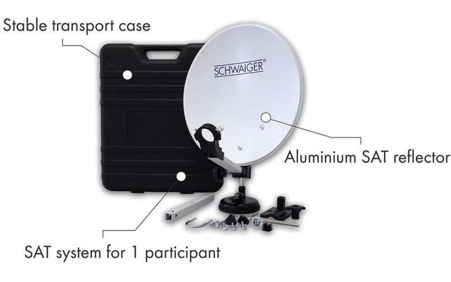 Diese HDTV taugliche SCHWAIGER Satellitenanlage ist speziell für den mobilen Einsatz zusammengestellt. Mit diesem Paket können alle unverschlüsselten Fernseh- und Radioprogramme über Satellit empfangen werden. Es handelt sich um ein Komplettpaket für einen Teilnehmer. Alle Komponenten sind optimal aufeinander abgestimmt. Die kleine mobile Satellitenanlage wird in einem Transportkoffer geliefert und enthält das komplette Montagezubehör.