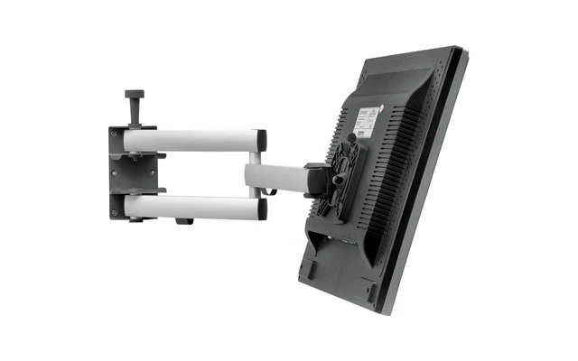 Wandhalterung mit Doppelgelenk (3 Drehpunkte), Arretierung, Quickrelease mit Schnellverschlusstaste und sauberer Kabelführung durch Kabelclips.