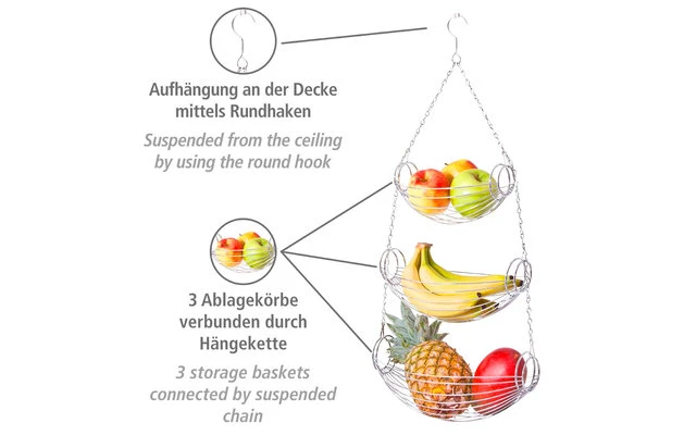 Diese formschöne Küchenampel ist eine nützlicher Helfer in jedem Haushalt. Mit drei Ablagekörben bietet sie viel Platz für Obst, Gemüse oder Kleinutensilien. Durch den praktischen Rundhaken wird die Ampel ganz einfach und platzsparend an der Decke aufgehängt.