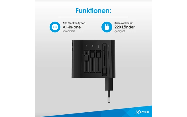 Kompakt und sicher: Alle Kontaktstifte sind platzsparend im Gehäuse untergebracht. So verbiegen sie nicht. Mit dem praktischen Schiebemechanismus holen Sie nur den gerade benötigten Stecker hervor. Dank handlicher Maße nimmt Ihr Adapter im Gepäck kaum Platz in Anspruch.